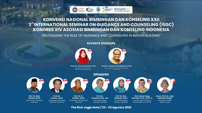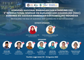 Post date: Friday, 26 August, 2022 - 10:54.(Selasa, 20/09). Program studi Bimbingan dan Konseling Universitas Negeri Yogyakarta menggelar Konvensi Nasional Bimbingan dan Konseling XXII, The 3rd International Seminar on Guidance and Counseling (ISGC), Kongres XIV Asosiasi Bimbingan dan Konseling Indonesia dengan tema “...